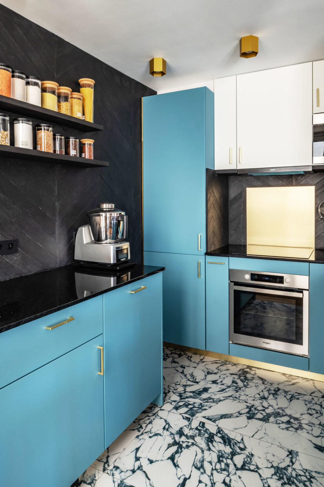 Rénovation complète d’un 90m2 dans le 6e arrondissement à Paris. L’appartement est composé d’une forme rectangulaire éclairée par de multiples ouvertures sur des cours et la rue. Le défi à été d’aménager la grande pièce à vivre centrale afin qu’elle desserve les chambres et les pièces annexes sans devenir un simple couloir de circulation. Les touches de couleurs ont permis de délimiter les espaces, et la variété des matériaux utilisés donnent corps à chaque pièce, quelle que soit sa taille.