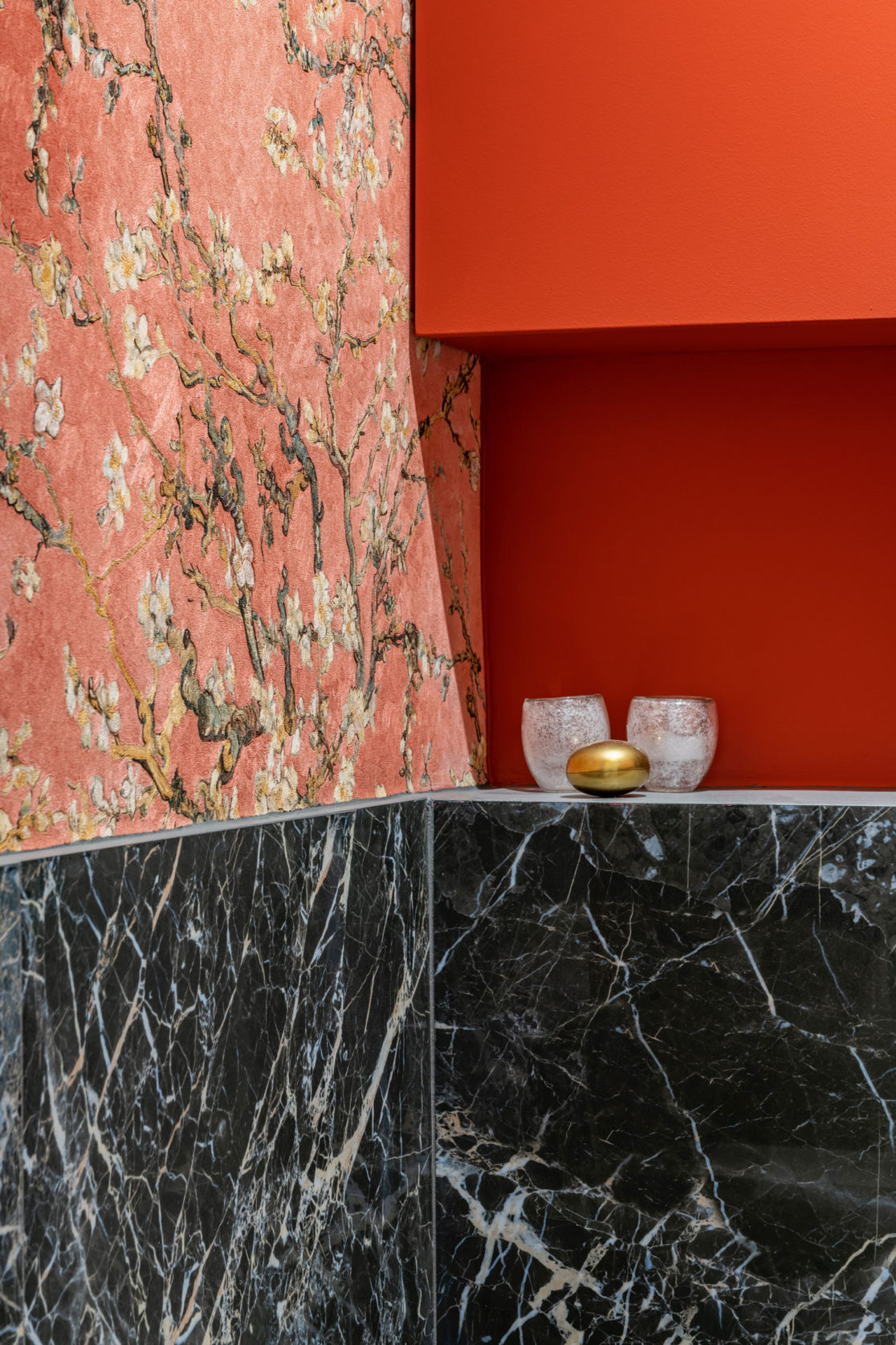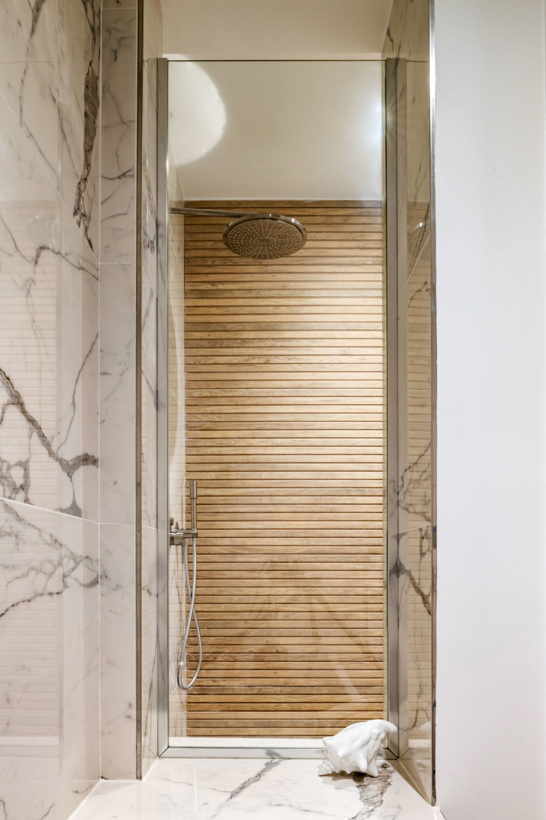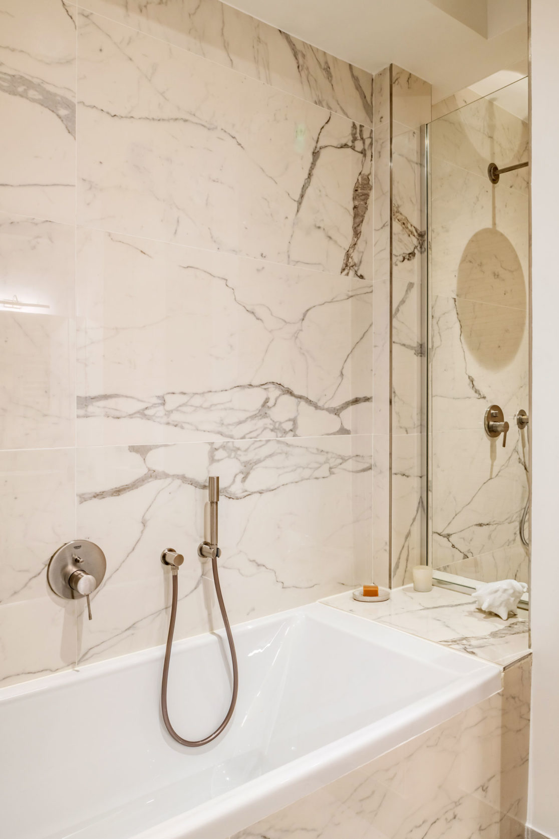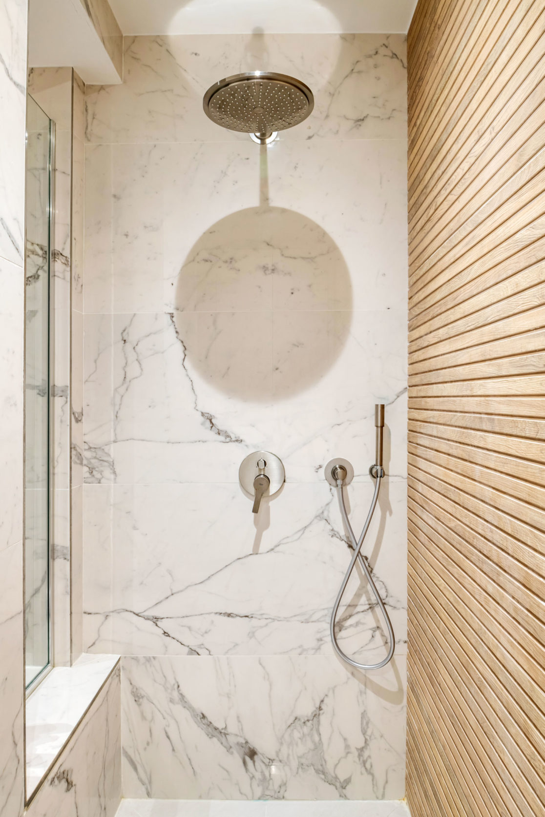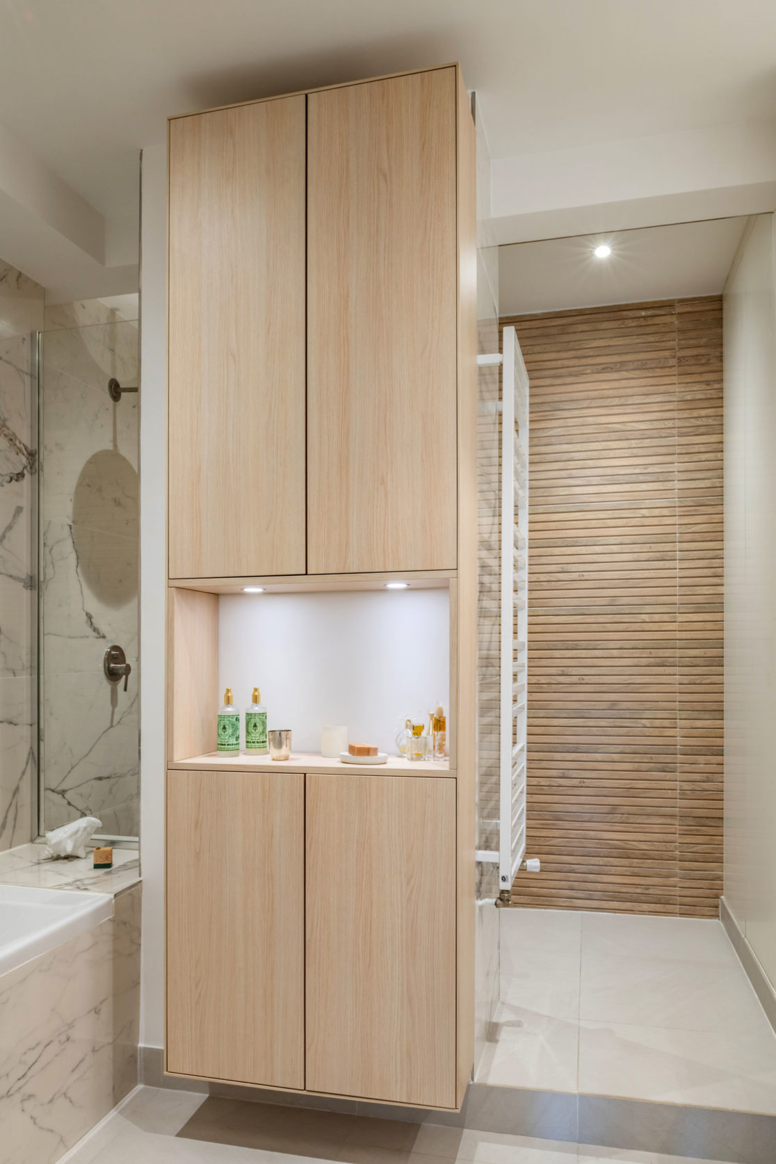 Dans la salle de bain, les matières minérales se répondent dans des tons clairs, et le carrelage façon bois réchauffe le grès cérame façon marbre.