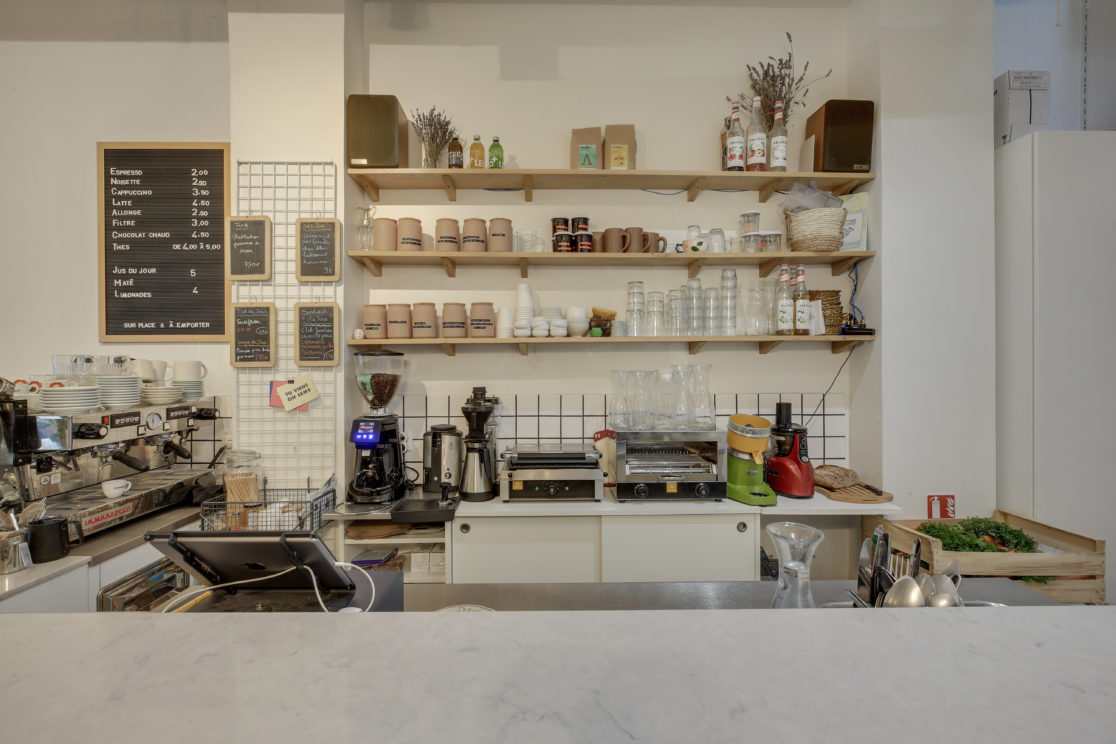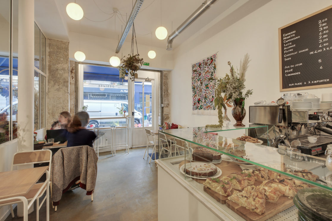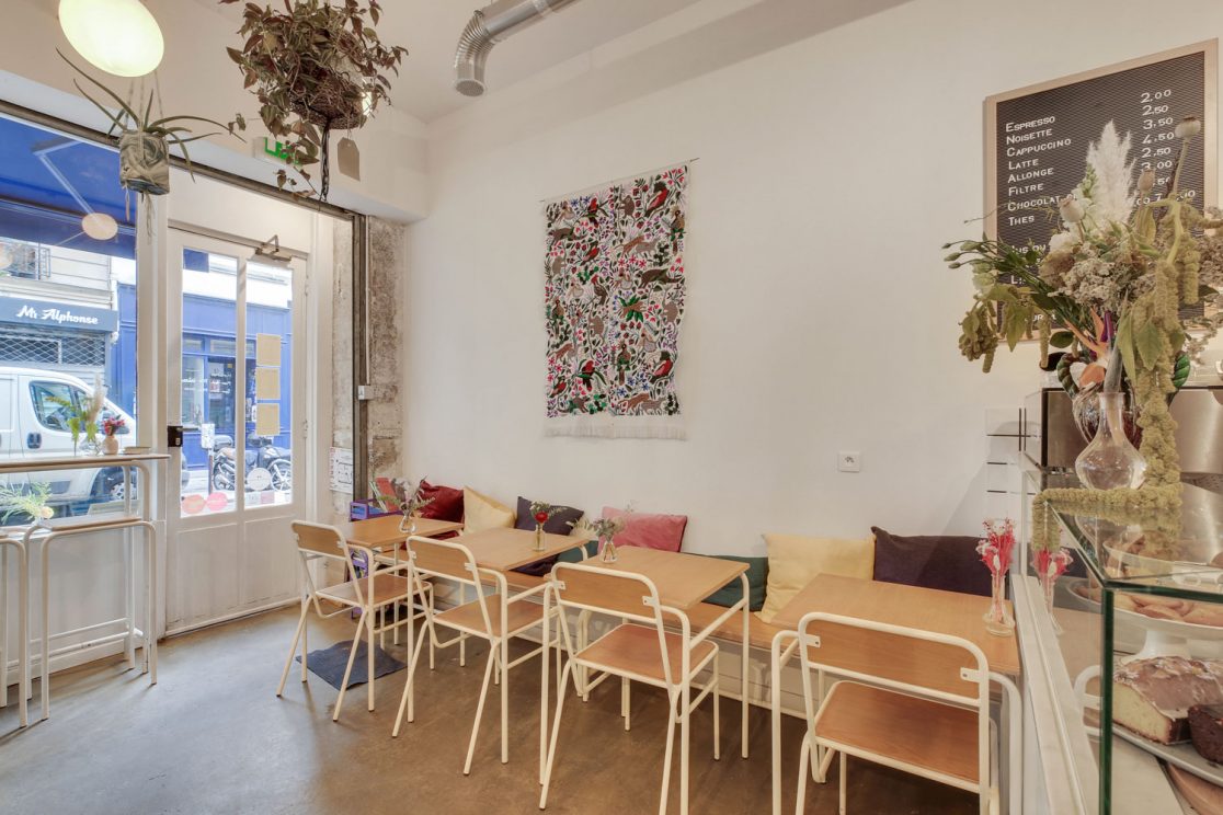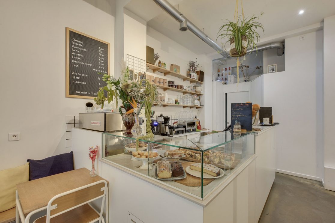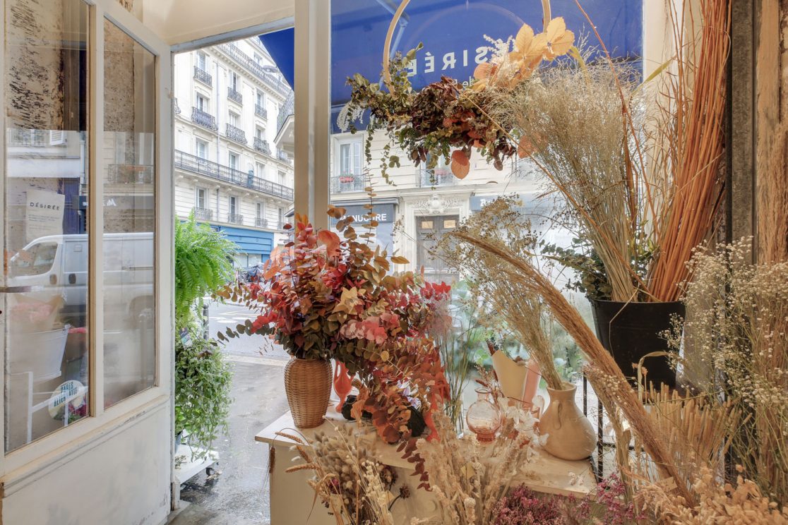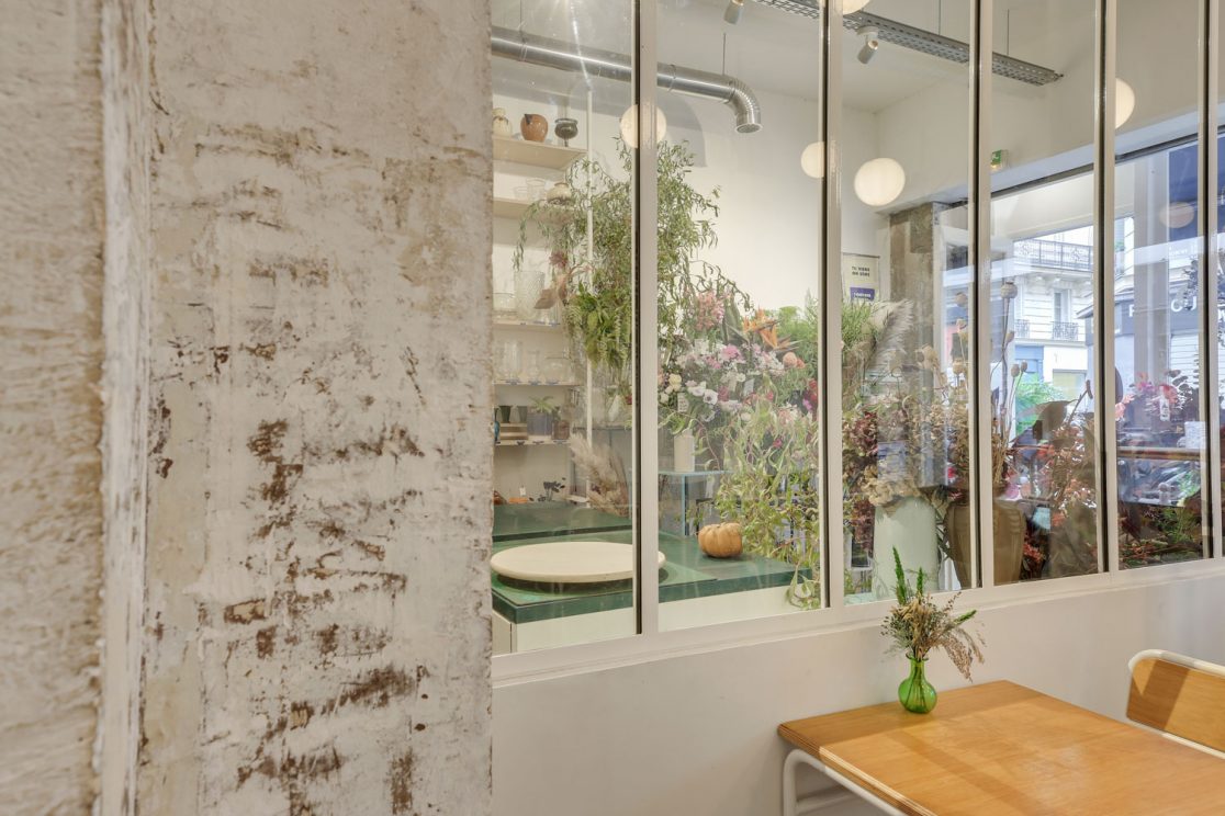 - Le local de Désirée est séparé en deux par une verrière qui laisse passer la lumière dans un lieu largement ouvert sur la rue. Côté boutique, les fleurs parlent d’elles-mêmes, tandis que du côté café, le bois s’allie à la couleur blanche pour réchauffer l’espace.